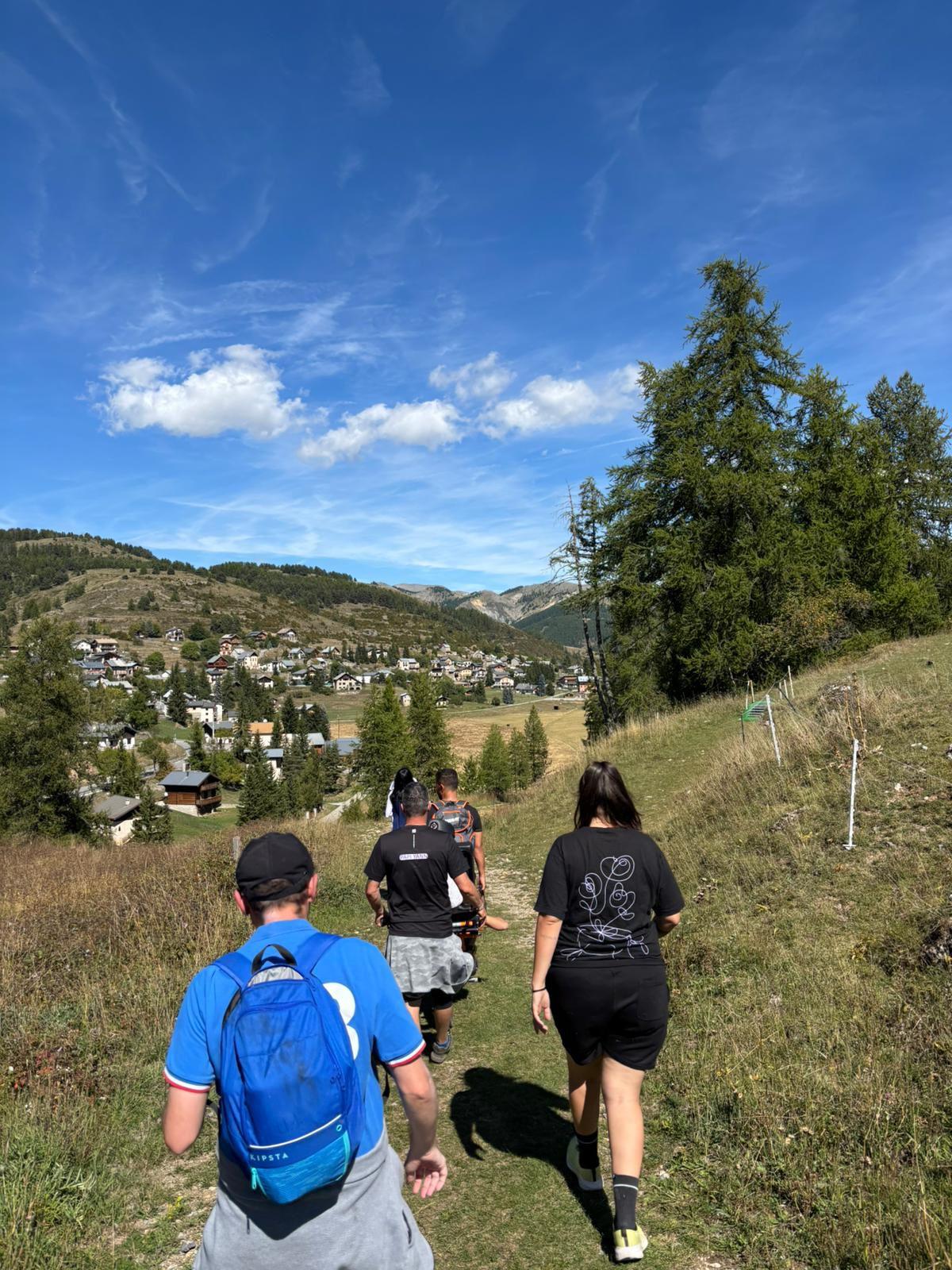Le groupe est arrivé sur le site en minibus. Dès l’arrivée, une attention particulière a été portée à l’évaluation des capacités physiques des participants, notamment pour l’un des résidents présentant des difficultés motrices importantes. Après concertation avec les éducatrices, qui ont confirmé la motivation et la détermination du résident concerné, la randonnée a pu débuter. Un accompagnement individualisé a été mis en place, avec une personne dédiée pour assurer la stabilité et la sécurité du résident le plus en difficulté.