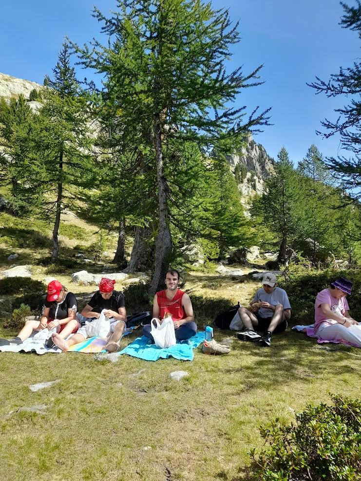 Nous avons atteint le lac après 2h15 de marche. Sur place, les résidents ont pu s’installer à l’ombre pour pique-niquer. Chacun avait pris une petite serviette, ce qui leur a permis de se reposer, certains faisant même une courte sieste. Avant de repartir, Sonia a présenté plusieurs photos d’animaux que l’on peut croiser dans le parc. Nous avons également eu la chance d’entendre le sifflement des marmottes.