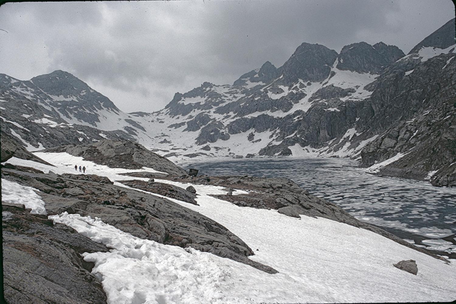Ici, le lac du Basto encore gelé le 6 juillet 1980 avec une vue sur la Baisse de Valmasque en arrière plan, comparé avec une photo du 24 juillet 2007, où aucun névé n'a persisté !