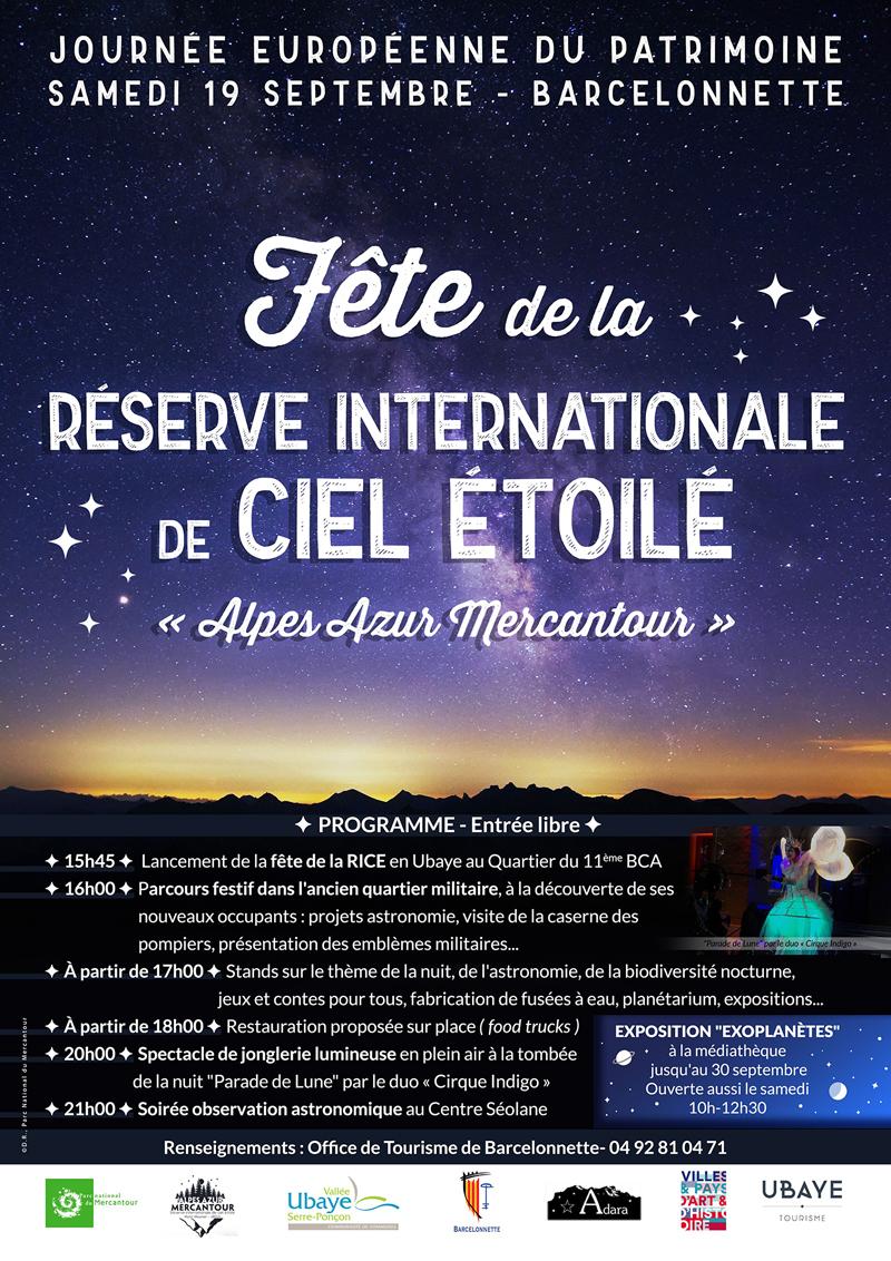 La fête de la RICE "Alpes Azur Mercantour" aura lieu à Barcelonnette le 19 septembre 2020. C'est une après-midi et soirée grand public, ouverte à tous, entrée libre dans le but de fêter la labellisation RICE (Réserve Internationale de Ciel Étoilé) du territoire "Alpes Azur Mercantour".