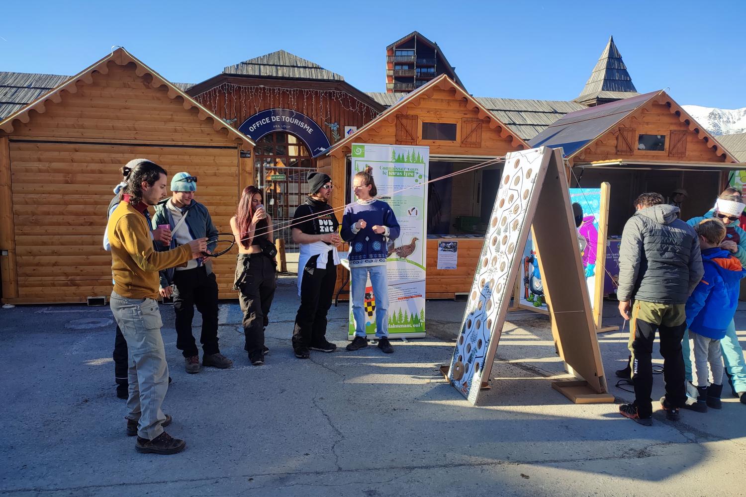 Le stand du Parc national du Mercantour avait pour objectif de sensibiliser le public du festival à l'impact des sports d’hiver sur la faune sauvage, en particulier sur les espèces vivant aux abords des pistes de ski. Le Tétras lyre, au cœur de notre message, était mis en avant sur la plupart de nos supports : jeu en bois, bâche imprimée, autocollants, planche passe-tête, etc. Espèce fragile et emblématique des paysages enneigés, le Tétras-lyre dépend de la quiétude hivernale pour survivre. Or, certaines pratiques comme le ski hors-piste et la raquette peuvent provoquer un dérangement menaçant sa survie. Beaucoup de visiteurs n’avaient pas conscience de la présence de cette biodiversité autour des stations de ski avant de découvrir notre stand. Après leur passage, plusieurs skieurs et snowboarders ont exprimé leur volonté d’éviter les zones sensibles lors de leurs sorties en hors-piste. Pour les inciter à réfléchir à leur impact tout en profitant de la montagne, un concours Instagram a été organisé, avec un forfait de ski pour la saison prochaine à la clé. La gagnante du concours a été tiré au sort ce lundi 31 mars, encore bravo ! Une approche ludique pour encourager une pratique plus respectueuse de la nature, sans pour autant l’interdire.